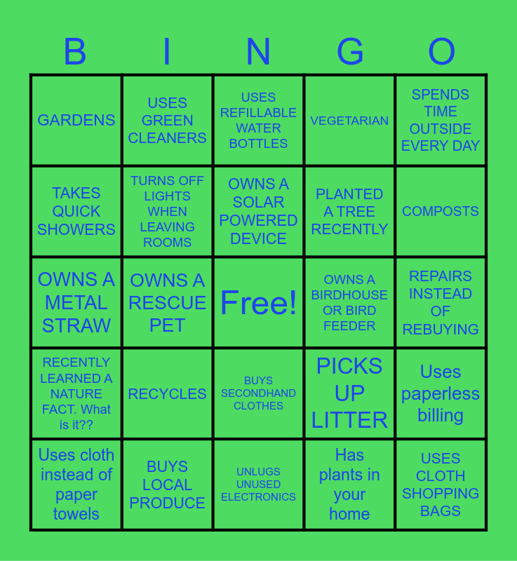 This bingo card has a free space and 24 words: RECYCLES, BUYS LOCAL PRODUCE, OWNS A SOLAR POWERED DEVICE, Uses cloth instead of paper towels, SPENDS TIME OUTSIDE EVERY DAY, GARDENS, TAKES QUICK SHOWERS, USES GREEN CLEANERS, OWNS A BIRDHOUSE OR BIRD FEEDER, BUYS SECONDHAND CLOTHES, PLANTED A TREE RECENTLY, OWNS A METAL STRAW, PICKS UP LITTER, Uses paperless billing, TURNS OFF LIGHTS WHEN LEAVING ROOMS, Has plants in your home, REPAIRS INSTEAD OF REBUYING, USES REFILLABLE WATER BOTTLES, COMPOSTS, OWNS A RESCUE PET, USES CLOTH SHOPPING BAGS, RECENTLY LEARNED A NATURE FACT. What is it??, VEGETARIAN and UNLUGS UNUSED ELECTRONICS.