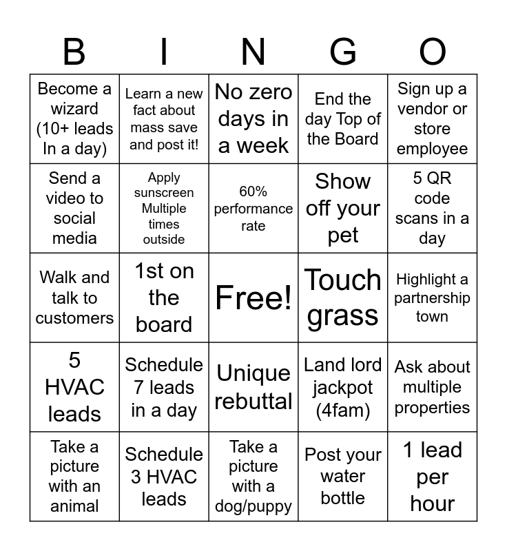 This bingo card has a free space and 24 words: Schedule 7 leads in a day, Schedule 3 HVAC leads, 60% performance rate, Take a picture with an animal, Sign up a vendor or store employee, Become a wizard (10+ leads In a day), Send a video to social media, Learn a new fact about mass save and post it!, Touch grass, Unique rebuttal, Show off your pet, Walk and talk to customers, Land lord jackpot (4fam), Ask about multiple properties, Apply sunscreen Multiple times outside, Post your water bottle, Highlight a partnership town, No zero days in a week, 5 QR code scans in a day, 1st on the board, 1 lead per hour, 5 HVAC leads, End the day Top of the Board and Take a picture with a dog/puppy.