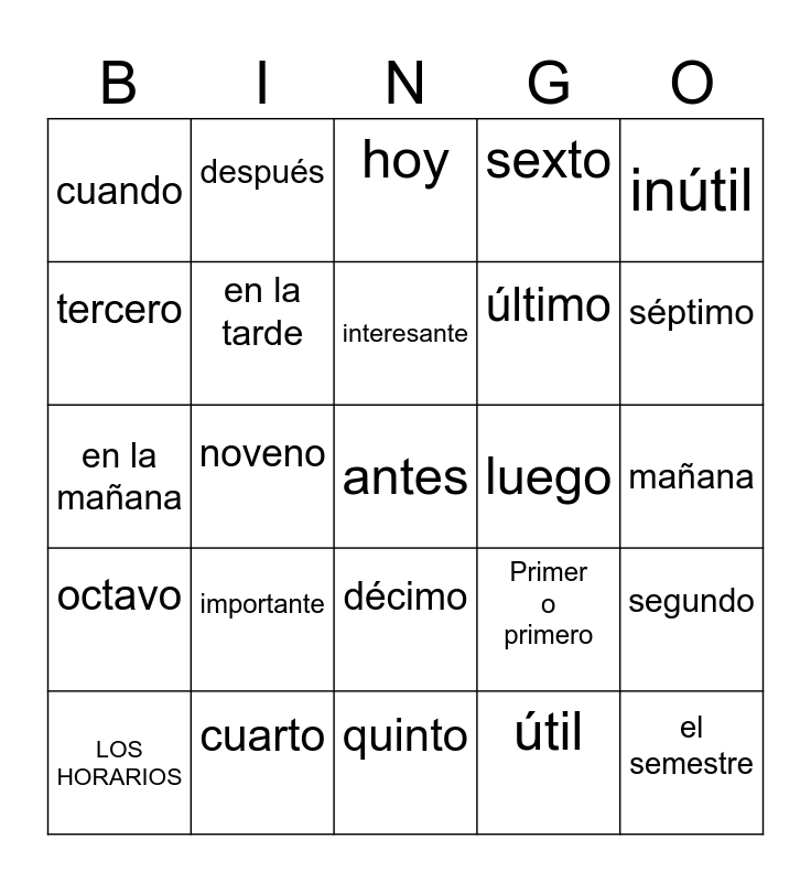 This bingo card has a free space and 24 words: LOS HORARIOS, importante, interesante, útil, inútil, cuando, después, hoy, luego, mañana, en la mañana, en la tarde, Primer o primero, segundo, tercero, cuarto, quinto, sexto, séptimo, octavo, noveno, décimo, último and el semestre.