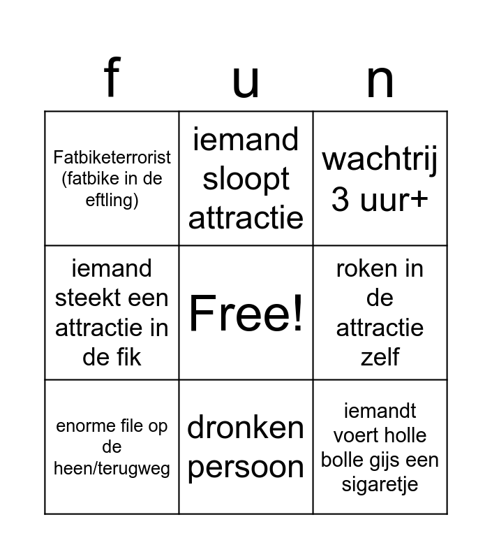 This bingo card has a free space and 8 words: roken in de attractie zelf, wachtrij 3 uur+, iemand sloopt attractie, enorme file op de heen/terugweg, Fatbiketerrorist (fatbike in de eftling), iemandt voert holle bolle gijs een sigaretje, iemand steekt een attractie in de fik and dronken persoon.