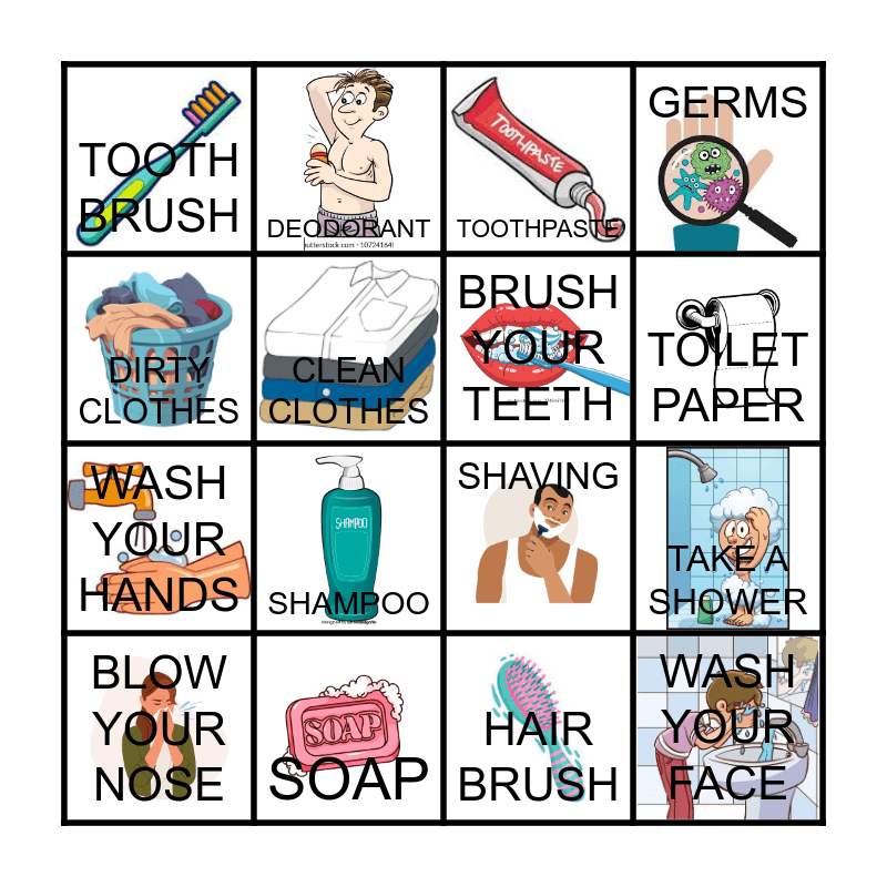 This bingo card has 16 images and 16 words: SOAP, TAKE A SHOWER, TOOTHPASTE, TOOTH BRUSH, WASH YOUR HANDS, DEODORANT, SHAVING, HAIR BRUSH, DIRTY CLOTHES, CLEAN CLOTHES, BLOW YOUR NOSE, GERMS, SHAMPOO, TOILET PAPER, BRUSH YOUR TEETH and WASH YOUR FACE.