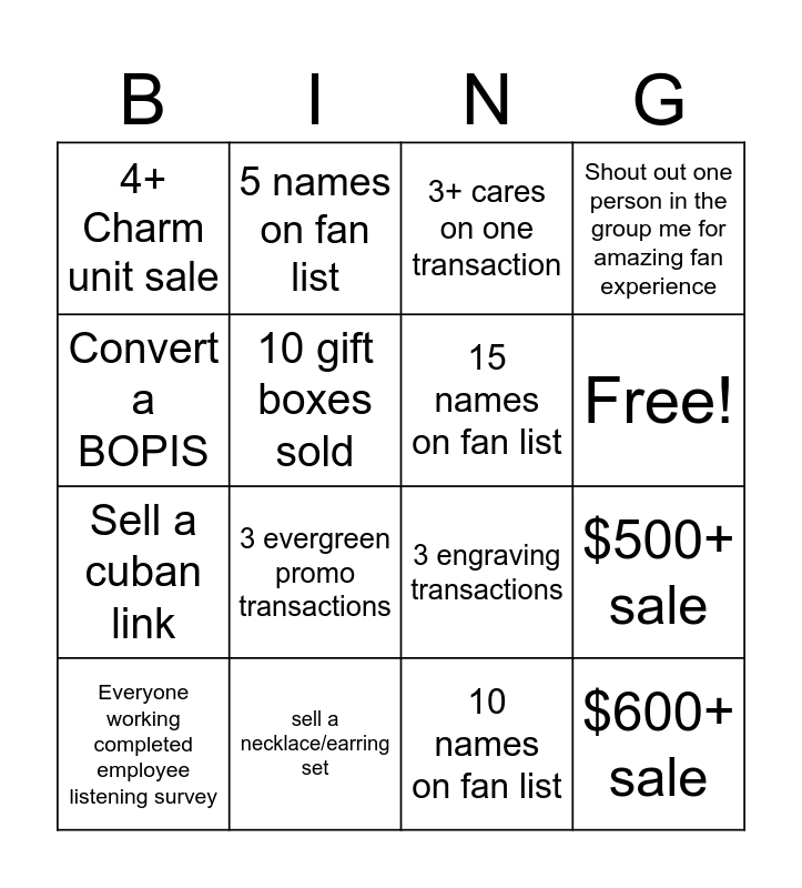 This bingo card has 17 words: 10 names on fan list, Everyone working completed employee listening survey, 3+ cares on one transaction, 4+ Charm unit sale, 3 evergreen promo transactions, Shout out one person in the group me for amazing fan experience, $500+ sale, 15 names on fan list, Free!, 10 gift boxes sold, sell a necklace/earring set, 3 engraving transactions, Convert a BOPIS, 5 names on fan list, Sell a cuban link, sell a ring stack (2+ rings) and $600+ sale.