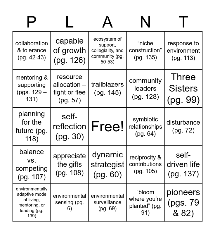 This bingo card has a free space and 30 words: environmental sensing (pg. 6), energy budgets (pg. 25 & 31), self-reflection (pg. 30), detection – judgement – decision paradigm (pg. 35), collaboration & tolerance (pg. 42-43), ecosystem of support, collegiality, and community (pg. 50-53), resource allocation – fight or flee (pg. 57), dynamic strategist (pg. 60), symbiotic relationships (pg. 64), environmental surveillance (pg. 69), disturbance (pg. 72), pioneers (pgs. 79 & 82), “bloom where you’re planted” (pg. 91), intentional disruption (pg. 93), Three Sisters (pg. 99), harmony (pg. 103), reciprocity & contributions (pg. 105), balance vs. competing (pg. 107), appreciate the gifts (pg. 108), response to environment (pg. 113), planning for the future (pg. 118), caretaker (pg. 122 & 125), capable of growth (pg. 126), community leaders (pg. 128), mentoring & supporting (pgs. 129 – 131), “niche construction” (pg. 135), self-driven life (pg. 137), environmentally adaptive mode of living, mentoring, or leading (pg. 139), trailblazers (pg. 145) and “sensor” roles (pg. 148).