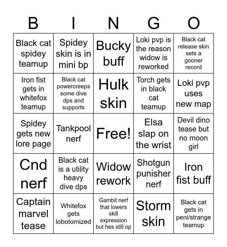 This bingo card has a free space and 24 words: Black cat is a utility heavy dive dps, Whitefox gets lobotomized, Hulk skin, Captain marvel tease, Black cat release skin sets a gooner record, Black cat spidey teamup, Iron fist gets in whitefox teamup, Spidey skin is in mini bp, Elsa slap on the wrist, Widow rework, Torch gets in black cat teamup, Spidey gets new lore page, Shotgun punisher nerf, Iron fist buff, Black cat powercreeps some dive dps and supports, Storm skin, Devil dino tease but no moon girl, Bucky buff, Loki pvp uses new map, Tankpool nerf, Black cat gets in peni/strange teamup, Cnd nerf, Loki pvp is the reason widow is reworked and Gambit nerf that lowers skill expression but hes still op.