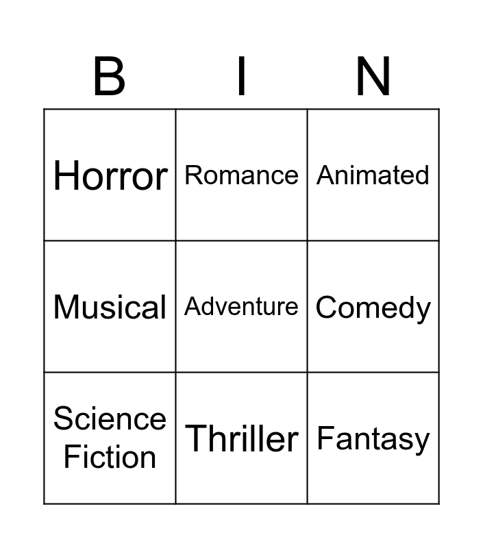 This bingo card has 11 words: Fantasy, Thriller, Adventure, Science Fiction, Romance, Animated, Comedy, Superhero, Musical, Horror and Western.