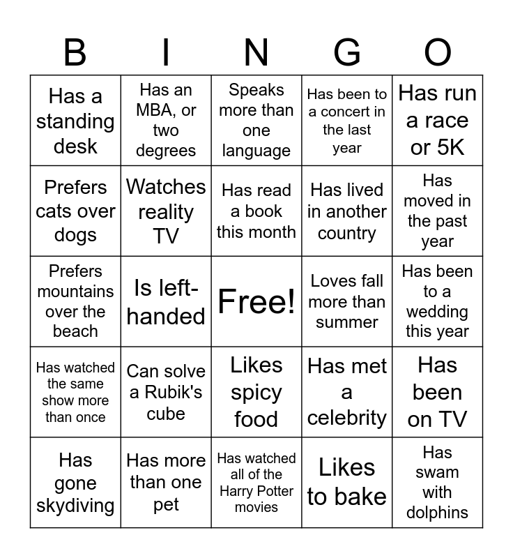This bingo card has a free space and 35 words: Is a Swiftie, Prefers salty snacks over sweet, Is a morning person, Watches reality TV, Likes spicy food, Has been to a concert in the last year, Prefers cats over dogs, Has a birthday in Spring, Has read a book this month, Has more than one sibling, Prefers mountains over the beach, Has run a race or 5K, Likes pineapple on pizza, Has been to Disney, Has a standing desk, Loves fall more than summer, Likes to bake, Is left-handed, Has watched the same show more than once, Has swam with dolphins, Has met a celebrity, Has gone skydiving, Has been on TV, Has more than one pet, Speaks more than one language, Has moved in the past year, Has worked at Tapestry over 5 years, Can play an instrument, Has lived in another country, Has been to a wedding this year, Has a go to karaoke song (must say what it is), Has watched all of the Harry Potter movies, Can solve a Rubik's cube, Has an MBA, or two degrees and Has gone to a museum in the past month.