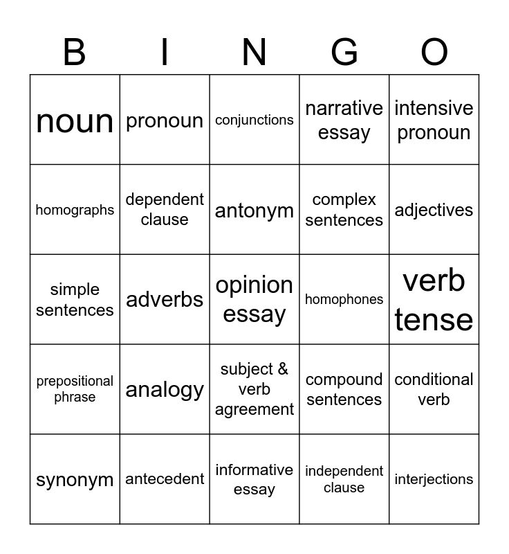 This bingo card has a free space and 24 words: analogy, antecedent, antonym, synonym, intensive pronoun, noun, homographs, pronoun, homophones, subject & verb agreement, complex sentences, simple sentences, compound sentences, conditional verb, dependent clause, independent clause, verb tense, conjunctions, adjectives, adverbs, interjections, prepositional phrase, narrative essay and informative essay.