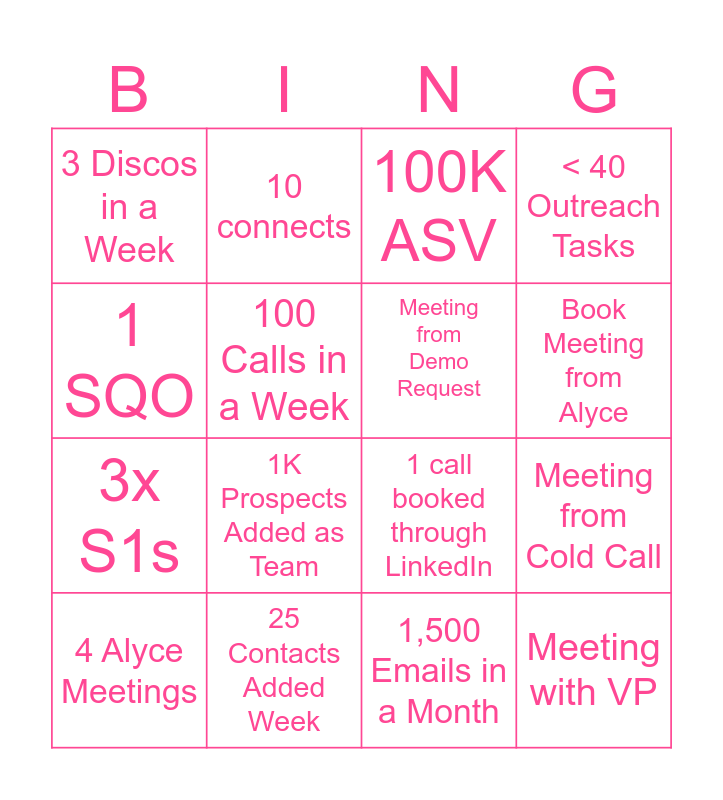 This bingo card has 37 words: 25 Leads Added Week, 75 TS1's Week, 5 SQOs, Meeting from Demo Request, 30 Calls in a Day, 150K ASV, Book Meeting from Alyce, 15 TS1's in 1 Day, 1 SQO, 500 emails in a week, Meeting from Cold Call, < 40 Outreach Tasks, 4 Alyce Meetings, 1,500 Emails in a Month, 100 Calls in a Week, Meeting with VP, 5 Qual Calls in a Week, 100K ASV, 5 Alyce Meetings, 25 Contacts Added Week, 3 Discos in a Week, 1K Prospects Added as Team, Meeting with Director, 75K ASV, 3 SQOs, 50 dials, 10 connects, Get past a gatekeeper, 5+ min convo, 40 emails, 20 LinkedIn messages / connections, 2 calls booked through email, 1 call booked through LinkedIn, Send a customer story, 6 demos scheduled, 3x S1s and 2x S2s.