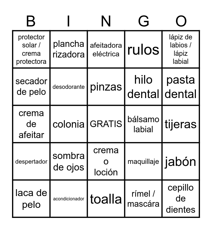 This bingo card has a free space and 29 words: laca de pelo, peine, colonia, papel higiénico, protector solar / crema protectora, afeitadora eléctrica, desodorante, sombra de ojos, bálsamo labial, acondicionador, tijeras, cepillo de dientes, toalla, rímel / mascára, pasta dental, champú, crema o loción, despertador, lápiz de labios / lápiz labial, crema de afeitar, maquillaje, navaja, hilo dental, secador de pelo, rulos, plancha rizadora, jabón, pinzas and cepillo de pelo.