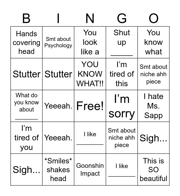 ⚠ This card has duplicate items: I hate Ms. Sapp (2), Sigh... (2), Freak You!! (2), Hands covering head (2), Goonshin Impact (2), Oh my god look at this _______ (2), Stutter (2), What do you know about _______ (2), I’m tired of this (2), I’m tired of you (2), Shut up _____ (2), Falls on knees (2), Smt about Psychology (2), Drawing in the air (2), Smt about Mahler (2), You know what (2), Yeeeah. (2), *Smiles* shakes head (2), This is SO beautiful (2), I’m sorry (2), Can I have your food (2), Smt about niche ahh piece (2), You look like a (2), DUDE *starts screaming* (2), YOU KNOW WHAT!! (2), I like ________ (2), Oh yeah I like (insert meat) (2)