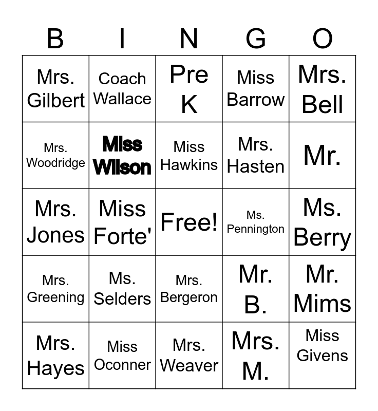 This bingo card has a free space and 44 words: Ms. Richard, Ms. Selders, Dr. Hennessy, Mrs. M., Mrs. Robinson, Mrs. Townes, Miss Wilson, Mrs. Benoit, Miss Barrow, Miss Givens, Mrs. Gilbert, Miss Oconner, Mr. B., Ms. Berry, Mr. Collins, Mrs. LeBlanc, Mrs. Weaver, Ms. Pennington, Mrs. Chapman, Mrs. Jones, Coach Wallace, Mrs. Bergeron, Miss Atkins, Mrs. Bell, Mrs. Hawkins, Mrs. Johnson, Miss Hawkins, Mrs. Current, Mr. Mims, Mrs. Hayes, Pre K, Pre K, Mrs. Cantwell, Mrs. Smith, Mrs. Greening, Ms. Ganes, Mrs. Meyers, Mrs. Annette, Mr., Mrs. Woodridge, Miss Forte', Mrs. T. Franklin, Mrs. Hasten and Mrs. Cannon.