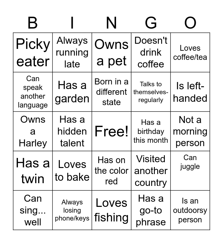 This bingo card has a free space and 24 words: Loves to bake, Always losing phone/keys, Born in a different state, Can sing... well, Loves coffee/tea, Picky eater, Can speak another language, Always running late, Has a birthday this month, Has on the color red, Talks to themselves-regularly, Owns a Harley, Visited another country, Can juggle, Has a garden, Has a go-to phrase, Not a morning person, Owns a pet, Is left-handed, Has a hidden talent, Is an outdoorsy person, Has a twin, Doesn't drink coffee and Loves fishing.