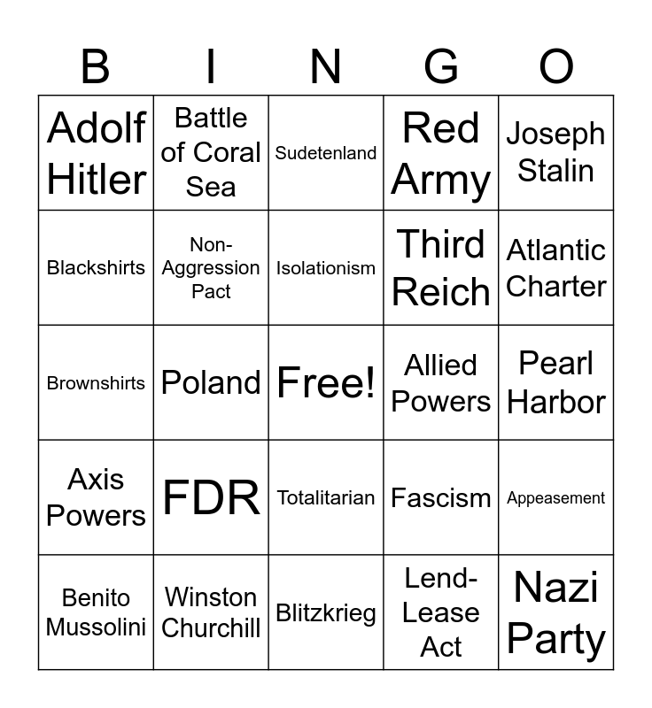 This bingo card has a free space and 24 words: FDR, Winston Churchill, Isolationism, Benito Mussolini, Joseph Stalin, Adolf Hitler, Blackshirts, Battle of Coral Sea, Allied Powers, Totalitarian, Third Reich, Brownshirts, Fascism, Appeasement, Non-Aggression Pact, Lend-Lease Act, Pearl Harbor, Sudetenland, Atlantic Charter, Poland, Nazi Party, Axis Powers, Red Army and Blitzkrieg.