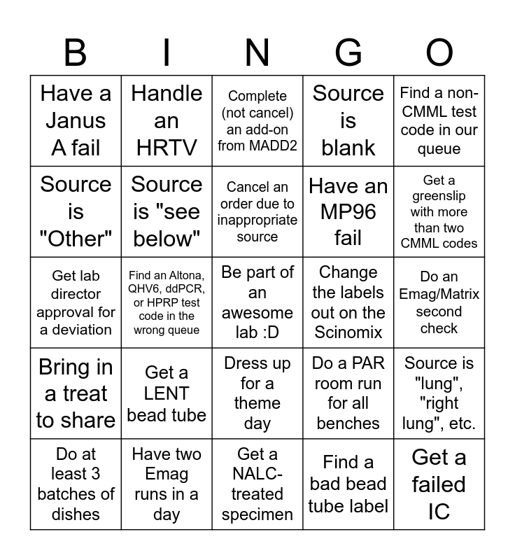 This bingo card has a free space and 46 words: Perform a fitpoint, Get a failed IC, Get an MTBRP stool, Get a NALC-treated specimen, Get a LENT bead tube, Handle a FLARP, Handle an HRTV, Handle a VRERP, Source is "Other", Source is "Swab", Source is "see below", Source is blank, Source is "lung", "right lung", etc., Do a PAR room run for all benches, Submit a request for more mastermix, Cancel an order due to age, Cancel an order due to inappropriate source, Change the labels out on the Scinomix, Build two or more plates to clear an array queue, Find a non-CMML test code in our queue, Find an Altona, QHV6, ddPCR, or HPRP test code in the wrong queue, Find a bad bead tube label, Have a Janus A fail, Have an MP96 fail, Get a "No Test Codes" on a passing non-dev sample, Get a greenslip with more than two CMML codes, Do at least 3 batches of dishes, Lead huddle, Dress up for a theme day, Bring in a treat to share, Answer the phone (non-Gremlin), Help Mol Prep (unscheduled), Get a double peak Tm, Get an indeterminate HSV, Repeat something in triplicate, Have two Emag runs in a day, Do an Emag/Matrix second check, Get a volume check fail/missed mastermix, Find and cancel a serum separator tube, Give a suggestion to MDI, Find additional specimen for a QNS order, Complete (not cancel) an add-on from MADD2, Get lab director approval for a deviation, Send a specimen for NALC treatment, Call for TS help and Manually re-queue a re-amp.