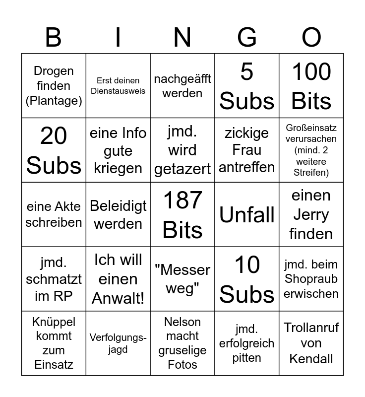 This bingo card has 25 words: Ich will einen Anwalt!, Nelson macht gruselige Fotos, jmd. wird getazert, Knüppel kommt zum Einsatz, 100 Bits, Drogen finden (Plantage), 20 Subs, Erst deinen Dienstausweis, Unfall, "Messer weg", zickige Frau antreffen, eine Akte schreiben, 10 Subs, jmd. beim Shopraub erwischen, eine Info gute kriegen, Trollanruf von Kendall, einen Jerry finden, nachgeäfft werden, Großeinsatz verursachen (mind. 2 weitere Streifen), Beleidigt werden, 187 Bits, Verfolgungs-jagd, jmd. schmatzt im RP, 5 Subs and jmd. erfolgreich pitten.