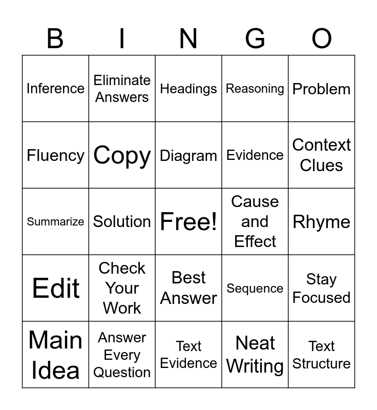 This bingo card has a free space and 56 words: Theme, Main Idea, Key Details, Inference, Text Evidence, Claim, Copy, Paste, Evidence, Four Sentences, Reasoning, Point of View, Narrator, Character, Setting, Plot, Problem, Solution, Central Idea, Text Structure, Cause and Effect, Compare and Contrast, Sequence, Headings, Caption, Diagram, Glossary, Vocabulary, Context Clues, Authors Purpose, Opinion, Fact, Poem, Stanza, Rhyme, Fluency, Summarize, Revise, Edit, Eliminate Answers, Best Answer, Reread, Read the Question First, Use the Text, Take Your Time, Check Your Work, Answer Every Question, Stay Calm, Good Nights Sleep, Healthy Breakfast, Neat Writing, Follow Directions, Use Evidence in Writing, Plan Your Response, Stay Focused and Don't Rush.