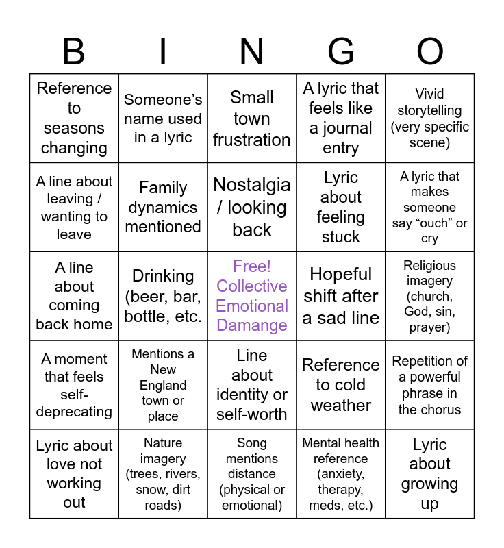 This bingo card has a free space and 24 words: Mentions a New England town or place, Nature imagery (trees, rivers, snow, dirt roads), Nostalgia / looking back, Lyric about love not working out, Vivid storytelling (very specific scene), Reference to seasons changing, A line about leaving / wanting to leave, Someone’s name used in a lyric, Hopeful shift after a sad line, Line about identity or self-worth, Lyric about feeling stuck, A line about coming back home, Reference to cold weather, Repetition of a powerful phrase in the chorus, Family dynamics mentioned, Mental health reference (anxiety, therapy, meds, etc.), Religious imagery (church, God, sin, prayer), Small town frustration, A lyric that makes someone say “ouch” or cry, Drinking (beer, bar, bottle, etc., Lyric about growing up, A moment that feels self-deprecating, A lyric that feels like a journal entry and Song mentions distance (physical or emotional).