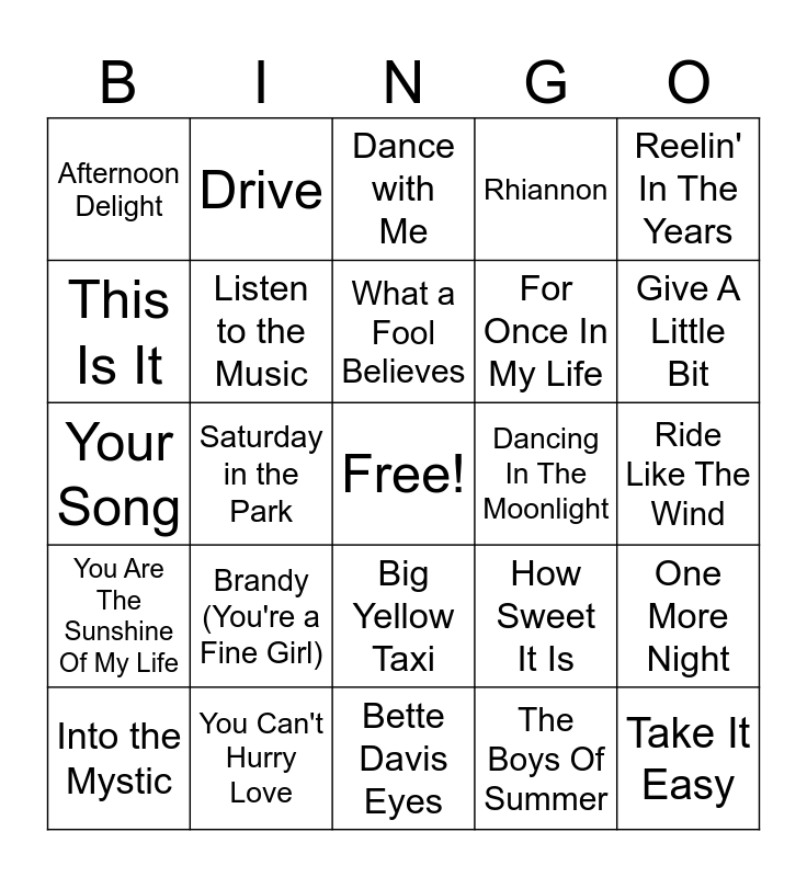 This bingo card has a free space and 37 words: Rich Girl, Sara Smile, What's Going On, Listen to the Music, One More Night, Brandy (You're a Fine Girl), What a Fool Believes, Let's Stay Together, Reelin' In The Years, Come and Get Your Love, Saturday in the Park, Rhiannon, Take It Easy, Ride Like The Wind, This Is It, You Are The Sunshine Of My Life, Rosanna, Dance with Me, Big Yellow Taxi, Dancing In The Moonlight, Afternoon Delight, Give A Little Bit, Into the Mystic, Bette Davis Eyes, What's Love Got to Do with It, The Boys Of Summer, Drive, If You Leave Me Now, I Can't Tell You Why, That's All, Mr. Blue Sky, You Can't Hurry Love, Your Song, Uptown Girl, How Sweet It Is, For Once In My Life and Maggie May.