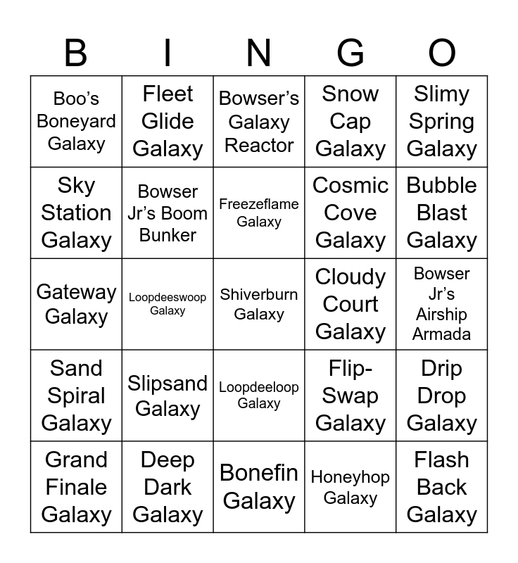 This bingo card has 91 words: Good Egg Galaxy, Honeyhive Galaxy, Loopdeeloop Galaxy, Flipswitch Galaxy, Bowser Jr’s Robot Reactor, Space Junk Galaxy, Battlerock Galaxy, Hurry-Scurry Galaxy, Bowser’s Star Reactor, Beach Bowl Galaxy, Ghostly Galaxy, Bubble Breeze Galaxy, Bouy Base Galaxy, Bowser Jr’s Airship Armada, Gusty Garden Galaxy, Freezeflame Galaxy, Dusty Dune Galaxy, Honeyclimb Galaxy, Bowser’s Dark Matter Plant, Gold Leaf Galaxy, Sea Slide Galaxy, Toy Time Galaxy, Bonefin Galaxy, Bowser Jr’s Lava Reactor, Gateway Galaxy, Deep Dark Galaxy, Dreadnought Galaxy, Melty Molten Galaxy, Matter Splatter Galaxy, Sweet Sweet Galaxy, Sling Pod Galaxy, Drip Drop Galaxy, Bigmouth Galaxy, Sand Spiral Galaxy, Boo’s Boneyard Galaxy, Snow Cap Galaxy, Bowser’s Galaxy Reactor, Rolling Gizmo Galaxy, Loopdeeswoop Galaxy, Bubble Blast Galaxy, Grand Finale Galaxy, Sky Station Galaxy, Yoshi Star Galaxy, Spin-Dig Galaxy, Fluffy Bluff Galaxy, Flip-Swap Galaxy, Rightside Down Galaxy, Bowser Jr’s Fiery Flotilla, Puzzle Plank Galaxy, Hightail Falls Galaxy, Boulder Bowl Galaxy, Cosmic Cove Galaxy, Wild Glide Galaxy, Honeybloom Galaxy, Bowser’s Lava Lair, Tall Trunk Galaxy, Cloudy Court Galaxy, Haunty Halls Galaxy, Freezy Flake Galaxy, Rolling Masterpiece Galaxy, Beat Block Galaxy, Bowser Jr’s Fearsome Fleet, Supermassive Galaxy, Flipsville Galaxy, Starshine Beach Galaxy, Chompworks Galaxy, Sweet Mystery Galaxy, Honeyhop Galaxy, Bowser’s Gravity Gauntlet, Space Storm Galaxy, Slipsand Galaxy, Shiverburn Galaxy, Boo Moon Galaxy, Upside Dizzy Galaxy, Fleet Glide Galaxy, Bowser Jr’s Boom Bunker, Melty Monster Galaxy, Clockwork Ruins Galaxy, Throwback Galaxy, Battle Belt Galaxy, Flash Back Galaxy, Slimy Spring Galaxy, Bowser’s Galaxy Generator, Mario Squared Galaxy, Rolling Coaster Galaxy, Twisty Trials Galaxy, Stone Cyclone Galaxy, Boss Blitz Galaxy, Flip-Out Galaxy, Grandmaster Galaxy and Rolling Green Galaxy.