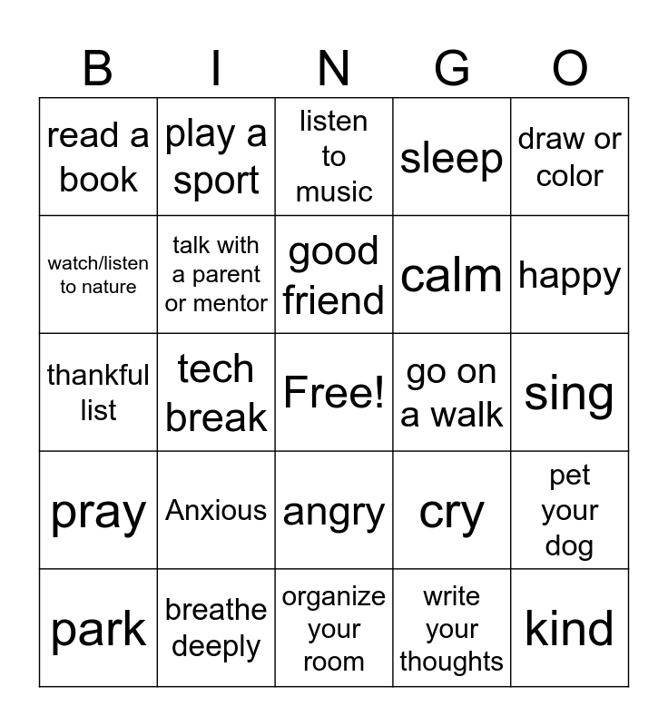 This bingo card has a free space and 24 words: Anxious, breathe deeply, good friend, park, draw or color, read a book, watch/listen to nature, play a sport, go on a walk, angry, calm, thankful list, cry, pet your dog, talk with a parent or mentor, write your thoughts, sing, listen to music, happy, tech break, kind, pray, sleep and organize your room.