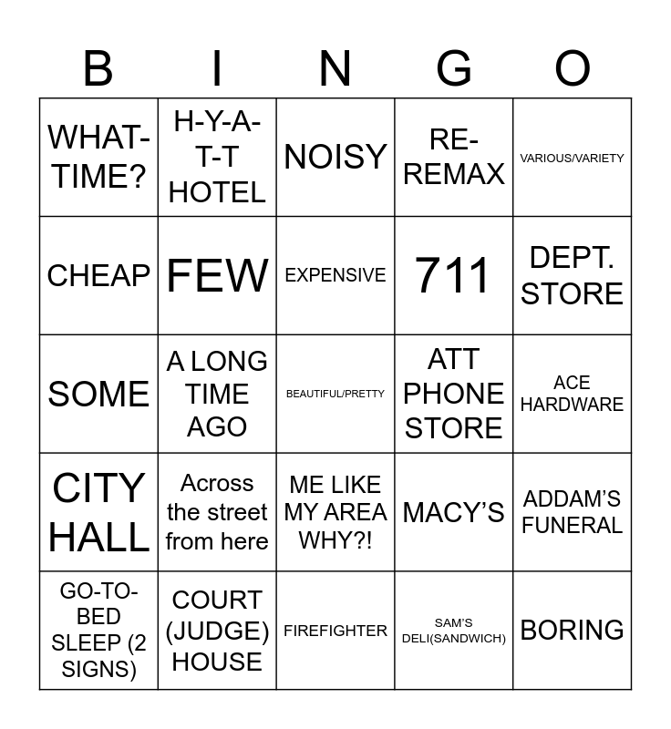 This bingo card has 77 words: Free!, QUIET, NOISY, S-A-F-E, DANGEROUS, EMPTY STREETS, TRAFFIC, CLEAN, DIRTY, SMELL STINK, BORING, MANY DO-DO, EXPENSIVE, CHEAP, SINCE, A LONG TIME AGO, CHANGE OVER TIME, BEAUTIFUL/PRETTY, DIFFERENT (semi-circle), VARIOUS/VARIETY, MOST, SOME, FEW, H-Y-A-T-T HOTEL, RE- REMAX, STABUCKS, COFFEE HOUSE, CURVES(EXERCISE), McDONALD’S, FAST FOOD, IKEA, FURNITURE (2hands), AAA – CAR INSURANCE, MACY’S, DEPT. STORE, 711, SMALL STORE OPEN ALL NIGHT, ABC LIQUOR STORE, ACE HARDWARE, SAM’S DELI(SANDWICH), SANDWICH, LEAVE (2 SIGNS), ARRIVE, START, FINISH, GET UP, GO-TO-BED SLEEP (2 SIGNS), WHAT-TIME?, A panoramic view, SUNSET, MY HOME AREA LOOK-LIKE WHAT?!, ME LIKE MY AREA WHY?!, ONE ME NOT LIKE WHAT?!, SINCE, AREA LOOK-LIKE WHAT?!, NEARBY, MANY, AREA, AREA VARIOUS/VARIETY, DIFF, DIFF, DIFF (semi-circle), Across the street from here, On the right side, On the left side, Behind my house, LIKE AREA WHY?, ONE ME NOT LIKE, WHAT?, ME STAY UNTIL, ATT PHONE STORE, DOLLAR STORE, CHEAP, DISCOUNT, ADDAM’S FUNERAL, CITY HALL, COURT (JUDGE) HOUSE, POLICE, FIREFIGHTER and PARKING.