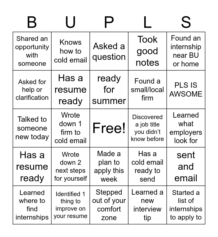 This bingo card has a free space and 29 words: Learned where to find internships, Applied to 3+ internships, Wrote down 1 firm to cold email, Used LinkedIn to search, Shared an opportunity with someone, Asked a question, Has a resume ready, Wrote down 2 next steps for yourself, Discovered a job title you didn’t know before, Identified 1 thing to improve on your resume, Learned what employers look for, Started a list of internships to apply to, Stepped out of your comfort zone, Learned a new interview tip, PLS IS AWSOME, Found an internship to apply to, Made a plan to apply this week, Has a resume ready, Found an internship near BU or home, Talked to someone new today, Has a cold email ready to send, Updated resume recently, Found a small/local firm, Asked for help or clarification, Took good notes, Knows how to cold email, sent and email, ready for summer and knows what not to do for resume.