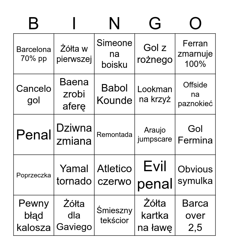 This bingo card has a free space and 24 words: Yamal tornado, Żółta dla Gaviego, Babol Kounde, Pewny błąd kalosza, Ferran zmarnuje 100%, Barcelona 70% pp, Cancelo gol, Żółta w pierwszej, Araujo jumpscare, Atletico czerwo, Lookman na krzyż, Penal, Evil penal, Obvious symulka, Baena zrobi aferę, Żółta kartka na ławę, Gol Fermina, Simeone na boisku, Offside na paznokieć, Dziwna zmiana, Barca over 2,5, Poprzeczka, Gol z rożnego and Śmieszny tekścior.