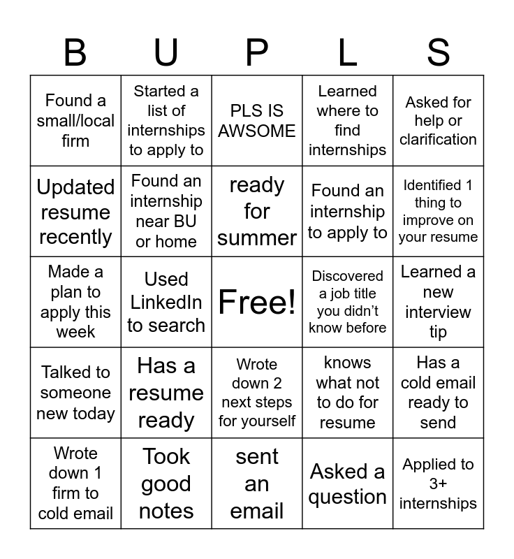 This bingo card has a free space and 28 words: Has a cold email ready to send, Knows how to cold email, Found an internship to apply to, Asked a question, Updated resume recently, PLS IS AWSOME, Started a list of internships to apply to, Talked to someone new today, Discovered a job title you didn’t know before, Wrote down 1 firm to cold email, Made a plan to apply this week, Learned where to find internships, Took good notes, sent an email, Identified 1 thing to improve on your resume, Learned what employers look for, Has a resume ready, Found an internship near BU or home, ready for summer, Wrote down 2 next steps for yourself, Found a small/local firm, Stepped out of your comfort zone, Applied to 3+ internships, Used LinkedIn to search, Learned a new interview tip, knows what not to do for resume, Asked for help or clarification and Shared an opportunity with someone.