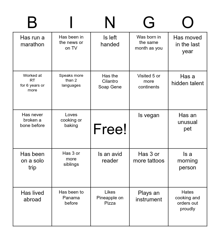 This bingo card has a free space and 24 words: Has 3 or more siblings, Has been to Panama before, Has the Cilantro Soap Gene, Has lived abroad, Has moved in the last year, Has run a marathon, Worked at RT for 6 years or more, Has been in the news or on TV, Is vegan, Is an avid reader, Visited 5 or more continents, Has never broken a bone before, Has 3 or more tattoos, Is a morning person, Speaks more than 2 languages, Plays an instrument, Has an unusual pet, Is left handed, Has a hidden talent, Loves cooking or baking, Hates cooking and orders out proudly, Has been on a solo trip, Was born in the same month as you and Likes Pineapple on Pizza.