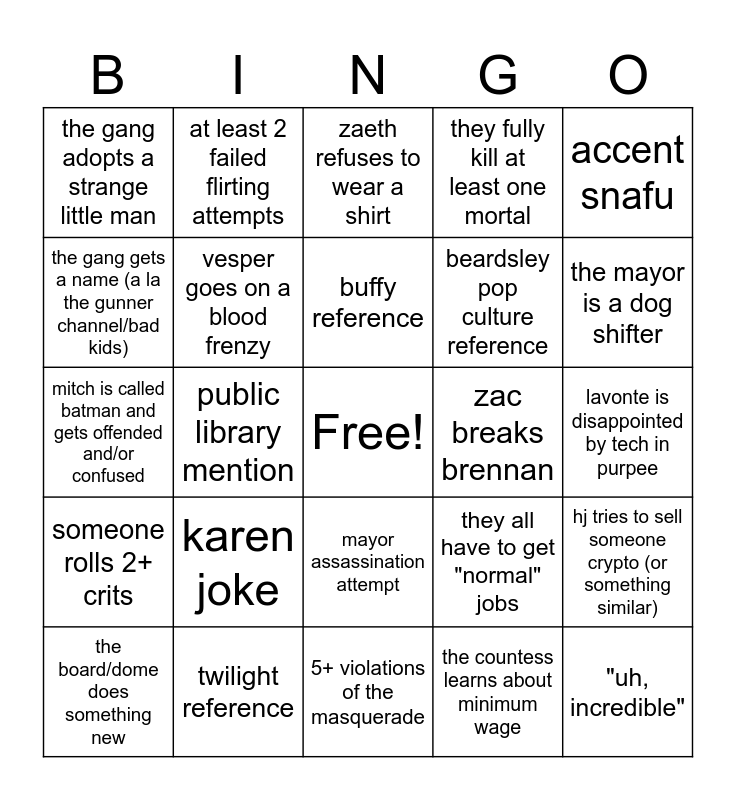 This bingo card has a free space and 24 words: karen joke, twilight reference, buffy reference, the board/dome does something new, accent snafu, the gang adopts a strange little man, the gang gets a name (a la the gunner channel/bad kids), at least 2 failed flirting attempts, zac breaks brennan, mayor assassination attempt, beardsley pop culture reference, mitch is called batman and gets offended and/or confused, they all have to get "normal" jobs, hj tries to sell someone crypto (or something similar), vesper goes on a blood frenzy, the countess learns about minimum wage, lavonte is disappointed by tech in purpee, zaeth refuses to wear a shirt, the mayor is a dog shifter, public library mention, "uh, incredible", someone rolls 2+ crits, they fully kill at least one mortal and 5+ violations of the masquerade.