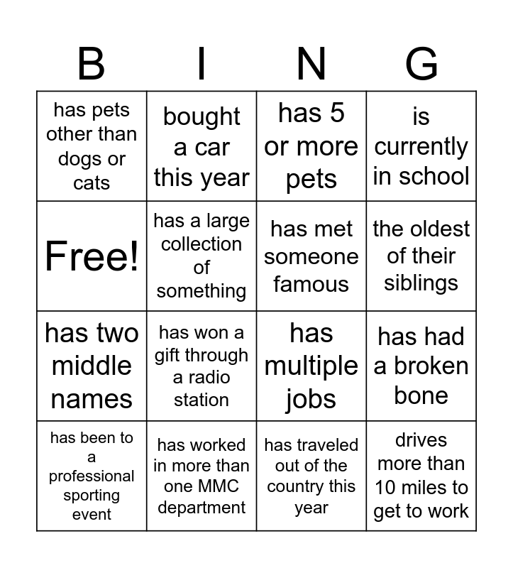 This bingo card has 16 words: has worked in more than one MMC department, has had a broken bone, has 5 or more pets, has pets other than dogs or cats, has two middle names, bought a car this year, has multiple jobs, has traveled out of the country this year, Free!, has a large collection of something, has been to a professional sporting event, is currently in school, has won a gift through a radio station, the oldest of their siblings, has met someone famous and drives more than 10 miles to get to work.