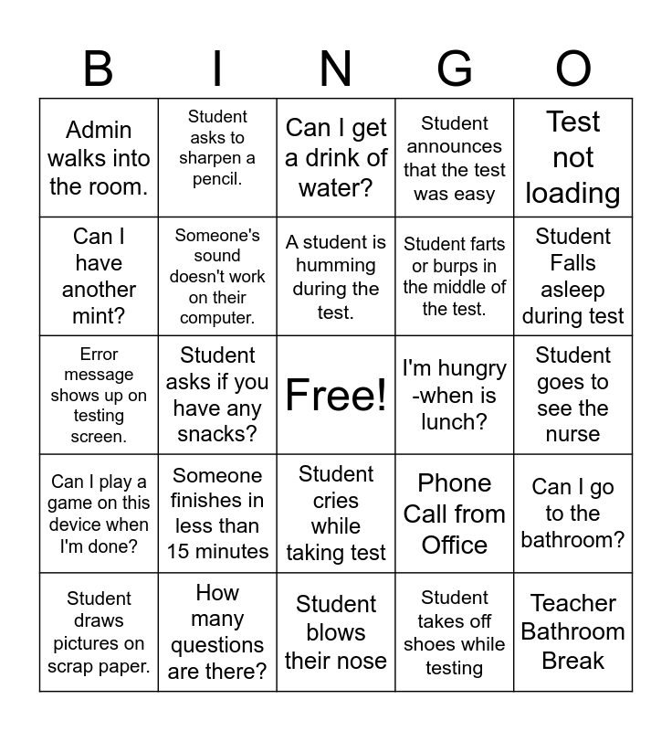 This bingo card has a free space and 28 words: Can I go to the bathroom?, Student lays on the floor., Student farts or burps in the middle of the test., Student takes off shoes while testing, Can I have another mint?, Can I get a drink of water?, Student asks to sharpen a pencil., Can I play a game on this device when I'm done?, I'm hungry -when is lunch?, Student draws pictures on scrap paper., Error message shows up on testing screen., Student announces that the test was easy, How many questions are there?, Student blows their nose, Student Falls asleep during test, Is this the only flavor of mints?, Someone finishes in less than 15 minutes, Someone's sound doesn't work on their computer., A student is humming during the test., Student cries while taking test, Admin walks into the room., Same kid tries to leave the room 3X, Teacher Bathroom Break, Student asks if you have any snacks?, Student goes to see the nurse, Phone Call from Office, Test not loading and Someone at your classroom door.