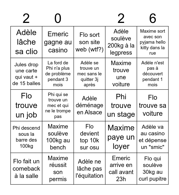 This bingo card has a free space and 24 words: Maxime soulève 100kg au bench, Maxime réussit son permis, Adèle se trouve un mec sans le quitter 3j après, Flo fait un comeback à la salle, Maxime sort avec son pyjama hello kitty dans la rue, Adèle lâche sa clio, Jules drop une carte qui vaut + de 15 balles, Emeric gagne au casino, Phi trouve un stage, Flo devient top 10k sur osu, Maxime trouve une voiture, Flo trouve un job, Maxime paye un loyer, Adèle va au casino et dépense un "smic", La ford de Phi n'a plus de problème pendant 3 mois, Emeric arrive en call avant 23h, Flo trouve sa voiture, Flo sort son site web (wtf?), Adèle n'est pas à découvert pendant 1 mois, Phi qui se trouve un mec et qui ne le trompe pas, Flo qui soulève 30kg au curl pupitre, Phi descend sous la barre des 100kg, Adèle soulève 200kg à la legpress and Adèle ne lâche pas l'équitation.