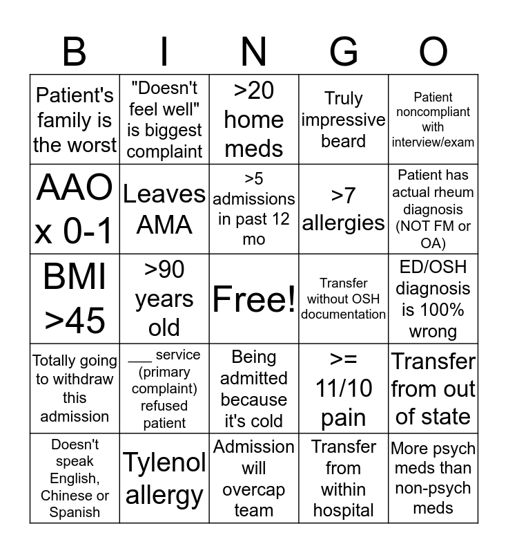 This bingo card has a free space and 24 words: ___ service (primary complaint) refused patient, Tylenol allergy, >5 admissions in past 12 mo, Doesn't speak English, Chinese or Spanish, Patient noncompliant with interview/exam, Patient's family is the worst, AAO x 0-1, "Doesn't feel well" is biggest complaint, Transfer without OSH documentation, Being admitted because it's cold, >7 allergies, BMI >45, >= 11/10 pain, Transfer from out of state, Leaves AMA, Transfer from within hospital, ED/OSH diagnosis is 100% wrong, >20 home meds, Patient has actual rheum diagnosis (NOT FM or OA), >90 years old, More psych meds than non-psych meds, Totally going to withdraw this admission, Truly impressive beard and Admission will overcap team.