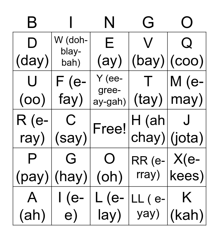 This bingo card has a free space and 29 words: A (ah), B (bay), C (say), CH (chay), D (day), E (ay), F (e-fay), G (hay), H (ah chay), I (e-e), J (jota), K (kah), L (e-lay), LL ( e- yay), M (e- may), N (e-nay), O (oh), P (pay), Q (coo), R (e-ray), RR (e-rray), S (e-say), T (tay), U (oo), V (bay), W (doh-blay-bah), X(e-kees), Y (ee- gree-ay-gah) and z (say- tah).