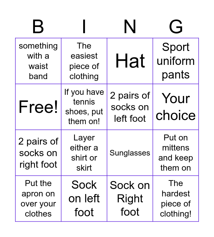 This bingo card has 16 words: Sock on left foot, Put on mittens and keep them on, Hat, something with a waist band, 2 pairs of socks on right foot, The easiest piece of clothing, Sunglasses, Sock on Right foot, Free!, If you have tennis shoes, put them on!, Put the apron on over your clothes, Sport uniform pants, Layer either a shirt or skirt, Your choice, 2 pairs of socks on left foot and The hardest piece of clothing!.