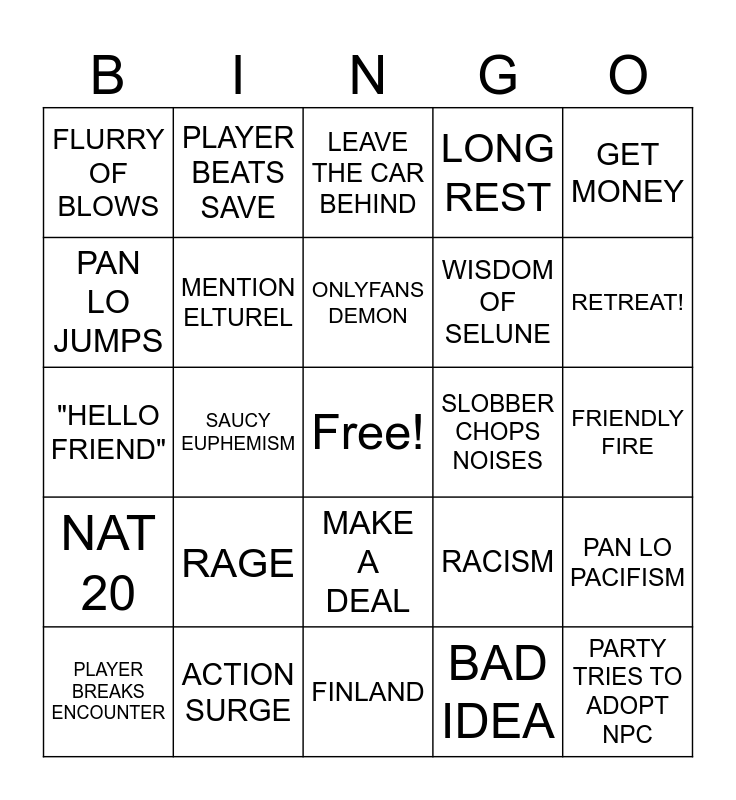 This bingo card has a free space and 54 words: NAT 1, NAT 20, SHORT REST, BADONK ADONK, MAKE A DEAL, FIRE BALL!, LONG REST, ROLL INITIATIVE, PAN LO JUMPS, CARDEN FLIES, FLURRY OF BLOWS, WILD SHAPE, ACTION SURGE, PLAYER BREAKS ENCOUNTER, TECHNICAL DIFFICULTIES, FINLAND, PARTY TRIES TO ADOPT NPC, WISDOM OF SELUNE, "DOES A __ HIT?", FRIENDLY FIRE, RACISM, DRAMATIC MOO, SLOBBER CHOPS NOISES, GET MONEY, PLAYER FAILS SAVE, PLAYER BEATS SAVE, ENEMY BEATS SAVE, ENEMY FAILS SAVE, MAGIC ITEM, BAD IDEA, MUNMIES, mEat?, LAUGH BREAK, USE INSPIRATION, LEAVE THE CAR BEHIND, CAT TALK, "HELLO FRIEND", PAN LO PACIFISM, MENTION ZARIEL, MENTION ELTUREL, TALK TO THE MAP, BOSS FIGHT, (don't) MENTION BEL PACT, TONK RUNS SOMEONE OVER, RAGE, ASTRAL ARMS, TALK TO THE SHIELD, MENTION OLD CHARACTER, ONLYFANS DEMON, SAUCY EUPHEMISM, RETREAT!, IDENTICAL ROLL, POP CULTURE REFERENCE and ORKY BORKY.