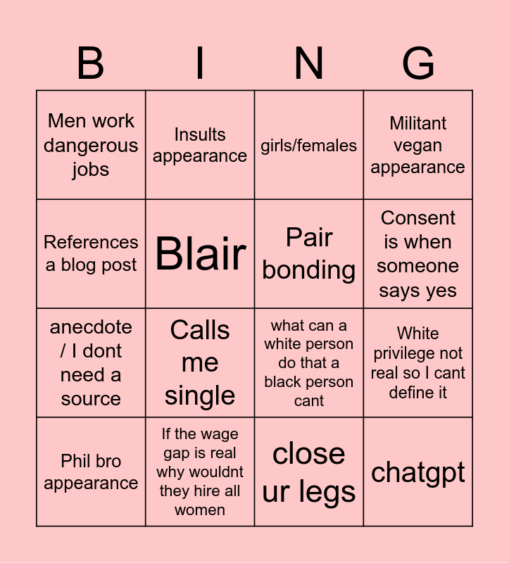This bingo card has 22 words: If the wage gap is real why wouldnt they hire all women, Slur to run, Insults appearance, But police are mostly men, Blair, Pair bonding, Men work dangerous jobs, girls/females, what can a white person do that a black person cant, chatgpt, anecdote / I dont need a source, Militant vegan appearance, google it, make me a sandwich, close ur legs, Planned parenthood is racist, White privilege not real so I cant define it, Phil bro appearance, Calls me single, References a blog post, Consent is when someone says yes and Body count matters because STIs.