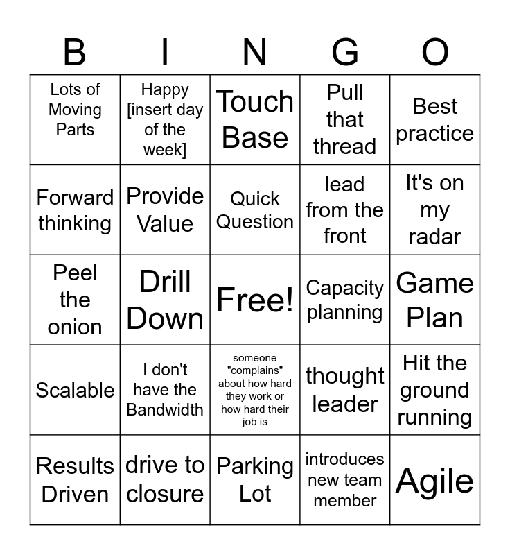 This bingo card has a free space and 36 words: closest alligator to the boat, Circle Back, Low Hanging Fruit, Provide Value, thought leader, Scalable, Quick Question, Space is Hard, Best practice, Living our values, Drill Down, Pull that thread, Leverage, Capacity planning, It's on my radar, Lots of Moving Parts, Deep Dive, I don't have the Bandwidth, Agile, Touch Base, Game Plan, Hit the ground running, drive to closure, Results Driven, Parking Lot, Happy [insert day of the week], Peel the onion, Synergize, lead from the front, Forward thinking, any weather related small talk, Personality base icebreaker, introduces new team member, someone "complains" about how hard they work or how hard their job is, I'm tracking and [insert current event joke].