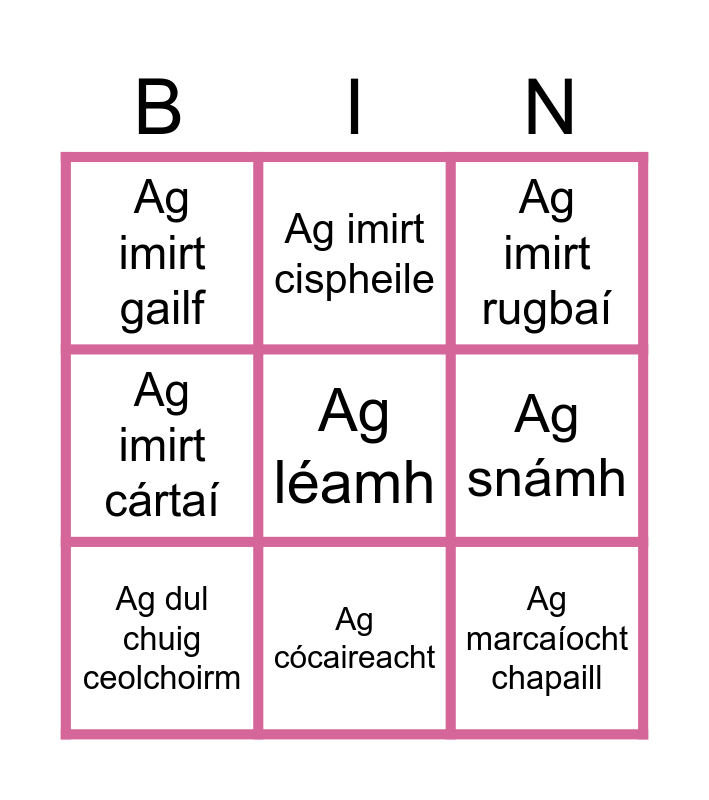 This bingo card has 15 words: Ag féachaint ar an teilifís, Ag seinm ceoil, Ag imirt rugbaí, Ag imirt gailf, Ag cócaireacht, Ag léamh, Ag imirt peile, Ag déanamh dramaíochta, Ag snámh, Ag marcaíocht chapaill, Ag imirt peile, Ag imirt cártaí, Ag dul chuig ceolchoirm, Ag imirt cispheile and Ag imirt snúcar.