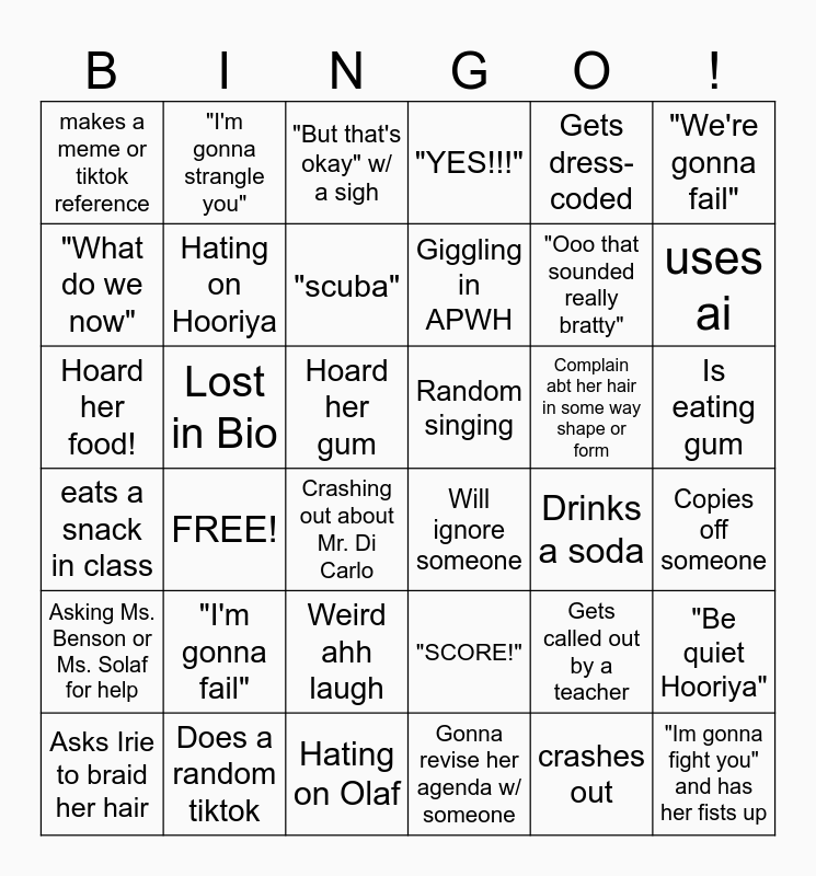 This bingo card has 36 words: "SCORE!", Weird ahh laugh, Gonna revise her agenda w/ someone, "What do we now", eats a snack in class, Random singing, Hating on Hooriya, Hating on Olaf, Gets dress-coded, Gets called out by a teacher, uses ai, "YES!!!", "Be quiet Hooriya", Lost in Bio, Giggling in APWH, makes a meme or tiktok reference, Asking Ms. Benson or Ms. Solaf for help, Complain abt her hair in some way shape or form, Hoard her food!, "But that's okay" w/ a sigh, Hoard her gum, FREE!, Will ignore someone, Crashing out about Mr. Di Carlo, Drinks a soda, "I'm gonna strangle you", "Ooo that sounded really bratty", Does a random tiktok, "scuba", "We're gonna fail", "Im gonna fight you" and has her fists up, Asks Irie to braid her hair, Copies off someone, Is eating gum, "I'm gonna fail" and crashes out.