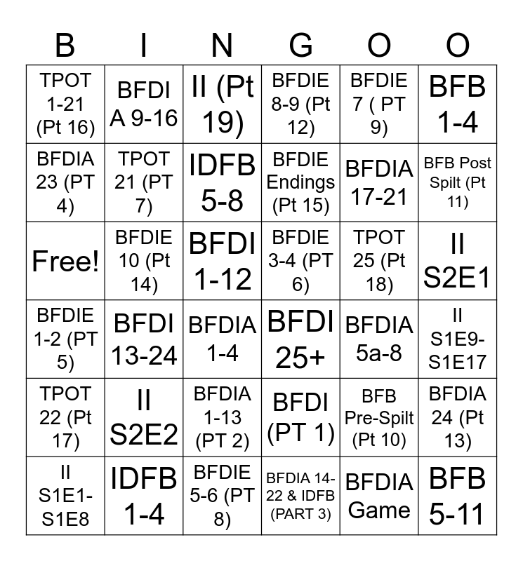 This bingo card has 36 words: BFDI (PT 1), BFDIA 1-13 (PT 2), BFDIA 14-22 & IDFB (PART 3), BFDIA 23 (PT 4), BFDIE 1-2 (PT 5), BFDIE 3-4 (PT 6), TPOT 21 (PT 7), BFDIE 5-6 (PT 8), BFDIE 7 ( PT 9), BFB Pre-Spilt (Pt 10), BFB Post Spilt (Pt 11), BFDIE 8-9 (Pt 12), BFDIA 24 (Pt 13), BFDIE 10 (Pt 14), BFDIE Endings (Pt 15), TPOT 1-21 (Pt 16), TPOT 22 (Pt 17), TPOT 25 (Pt 18), Free!, II (Pt 19), BFDI 1-12, BFDI 13-24, BFDI 25+, BFDIA 1-4, BFDIA 5a-8, BFDI A 9-16, BFDIA 17-21, IDFB 1-4, IDFB 5-8, BFB 1-4, BFB 5-11, II S1E1-S1E8, II S1E9-S1E17, II S2E1, II S2E2 and BFDIA Game.