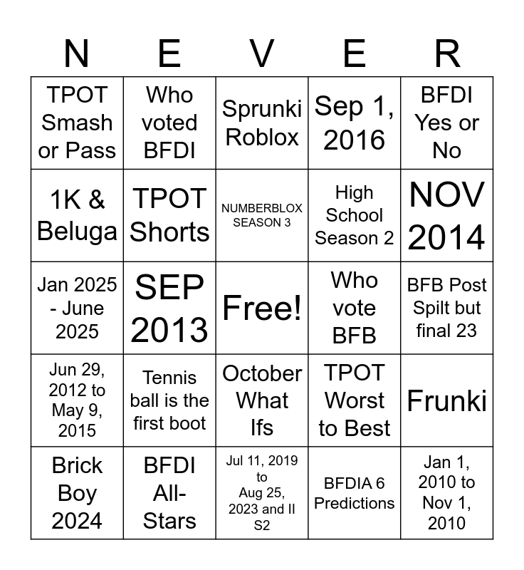 This bingo card has a free space and 24 words: Tennis ball is the first boot, BFDI All-Stars, NUMBERBLOX SEASON 3, Brick Boy 2024, BFDI Yes or No, TPOT Smash or Pass, 1K & Beluga, Who voted BFDI, Who vote BFB, October What Ifs, High School Season 2, Jan 2025 - June 2025, TPOT Worst to Best, Frunki, TPOT Shorts, BFDIA 6 Predictions, BFB Post Spilt but final 23, Sprunki Roblox, NOV 2014, SEP 2013, Jan 1, 2010 to Nov 1, 2010, Jun 29, 2012 to May 9, 2015, Sep 1, 2016 and Jul 11, 2019 to Aug 25, 2023 and II S2.