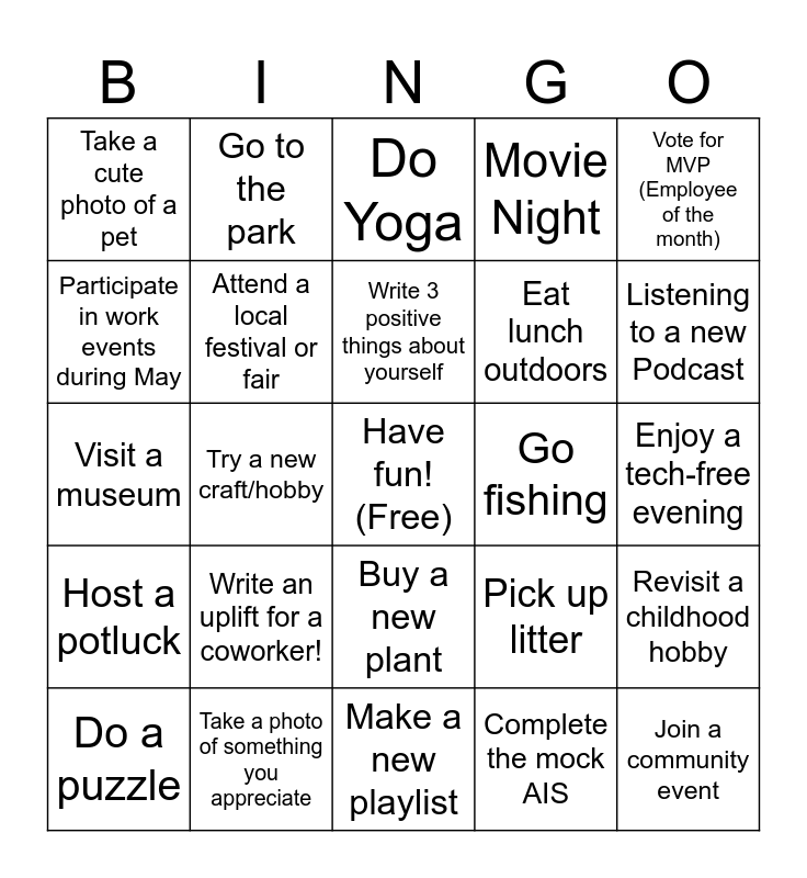 This bingo card has a free space and 49 words: Read a new book, Join a community event, Join the OPOP meeting (May 12th), Make a new playlist, Write an uplift for a coworker!, Try a new food, Go to the park, Try a new activity, Participate in work events during May, Go to the flea market, Attend a local festival or fair, Movie Night, Revisit a childhood hobby, Pick up litter, Take a silly photo, Donate something, Write 3 positive things about yourself, Go fishing, Send a thank you card, Vote for MVP (Employee of the month), Try a new craft/hobby, Complete the mock AIS, Take a cute photo of a pet, Eat lunch outdoors, Go swimming, Listening to a new Podcast, Do a puzzle, Go on a bike ride, Buy a new plant, Host a potluck, Call an old friend to catch up, Attend a concert, Go to a new store, Try a new video game, Take a photo of something you appreciate, Share your favorite quote with Skylar, Volunteer, Try a new ice cream flavor, Enjoy a tech-free evening, Start a journal, Friend/Family night, Watch the sunrise/sunset, Go thrifting, Grill, Visit a museum, Do Yoga, Play a card game, Have a picnic and Go for a nature walk.