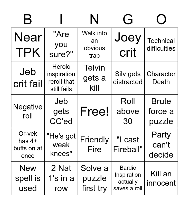 This bingo card has a free space and 30 words: 2 Nat 1's in a row, 2 Nat 20's in a row, Jeb gets CC'ed, 30+ damage in 1 attack, Near TPK, Walk into an obvious trap, Heroic inspiration reroll that still fails, Friendly Fire, Roll above 30, Solve a puzzle first try, Brute force a puzzle, Kill an innocent, Bardic Inspiration actually saves a roll, Aura farming, Character Death, Telvin Dies, "I cast Fireball", Or-vek has 4+ buffs on at once, "He's got weak knees", Technical difficulties, Negative roll, 2024 rule change, "Are you sure?", Silv gets distracted, Jeb crit fail, Joey crit, Party can't decide, New spell is used, Telvin gets a kill and Spongebob meme.