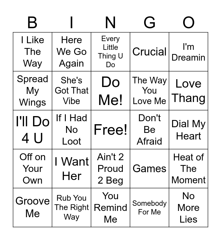 This bingo card has a free space and 24 words: I Want Her, Rub You The Right Way, Do Me!, Groove Me, I'm Dreamin, I Like The Way, Spread My Wings, Here We Go Again, Don't Be Afraid, Ain't 2 Proud 2 Beg, The Way You Love Me, I'll Do 4 U, Games, Heat of The Moment, She's Got That Vibe, Somebody For Me, Dial My Heart, Every Little Thing U Do, Love Thang, If I Had No Loot, No More Lies, Off on Your Own, Crucial and You Remind Me.