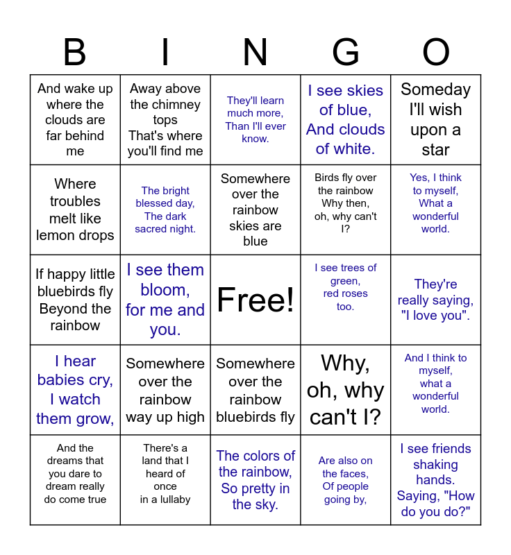 This bingo card has a free space and 24 words: Somewhere over the rainbow way up high, There's a land that I heard of once in a lullaby, Somewhere over the rainbow skies are blue, And the dreams that you dare to dream really do come true, Someday I'll wish upon a star, And wake up where the clouds are far behind me, Where troubles melt like lemon drops, Away above the chimney tops That's where you'll find me, I see trees of green, red roses too., Somewhere over the rainbow bluebirds fly, Birds fly over the rainbow Why then, oh, why can't I?, If happy little bluebirds fly Beyond the rainbow, Why, oh, why can't I?, And I think to myself, what a wonderful world., The bright blessed day, The dark sacred night., Are also on the faces, Of people going by,, They're really saying, "I love you"., They'll learn much more, Than I'll ever know., Yes, I think to myself, What a wonderful world., I see them bloom, for me and you., I see friends shaking hands. Saying, "How do you do?", I hear babies cry, I watch them grow,, I see skies of blue, And clouds of white. and The colors of the rainbow, So pretty in the sky..