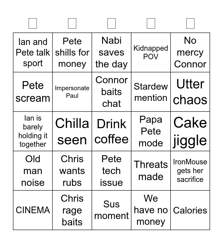 This bingo card has a free space and 24 words: Chris wants rubs, Chris rage baits, Connor baits chat, CINEMA, No mercy Connor, Ian and Pete talk sport, Pete scream, Pete shills for money, Papa Pete mode, Pete tech issue, Stardew mention, Ian is barely holding it together, Threats made, IronMouse gets her sacrifice, Impersonate Paul, We have no money, Cake jiggle, Nabi saves the day, Utter chaos, Chilla seen, Calories, Old man noise, Kidnapped POV and Sus moment.