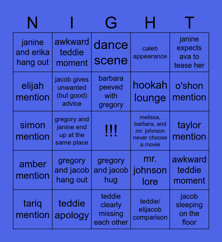 This bingo card has a free space and 24 words: gregory and jacob hang out, teddie apology, barbara peeved with gregory, tariq mention, janine expects ava to tease her, janine and erika hang out, elijah mention, awkward teddie moment, melissa, barbara, and mr. johnson never choose a movie, gregory and jacob hug, hookah lounge, simon mention, mr. johnson lore, awkward teddie moment, jacob gives unwanted (but good) advice, teddie/ elijacob comparison, taylor mention, dance scene, o'shon mention, gregory and janine end up at the same place, jacob sleeping on the floor, amber mention, caleb appearance and teddie clearly missing each other.