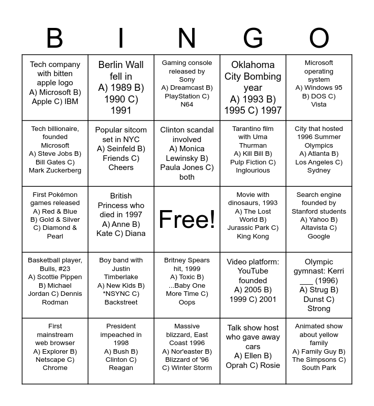 This bingo card has a free space and 29 words: First mainstream web browser A) Explorer B) Netscape C) Chrome, U.S. President for most of the 1990s A) Bush B) Clinton C) Obama, British Princess who died in 1997 A) Anne B) Kate C) Diana, Grunge band with Kurt Cobain A) Nirvana B) Pearl Jam C) Soundgarden, Tech company with bitten apple logo A) Microsoft B) Apple C) IBM, Gaming console released by Sony A) Dreamcast B) PlayStation C) N64, Popular sitcom set in NYC A) Seinfeld B) Friends C) Cheers, Boy band with Justin Timberlake A) New Kids B) *NSYNC C) Backstreet, Movie with dinosaurs, 1993 A) The Lost World B) Jurassic Park C) King Kong, President impeached in 1998 A) Bush B) Clinton C) Reagan, Search engine founded by Stanford students A) Yahoo B) Altavista C) Google, Animated show about yellow family A) Family Guy B) The Simpsons C) South Park, Massive blizzard, East Coast 1996 A) Nor'easter B) Blizzard of '96 C) Winter Storm, Talk show host who gave away cars A) Ellen B) Oprah C) Rosie, City that hosted 1996 Summer Olympics A) Atlanta B) Los Angeles C) Sydney, Reality show: Survivor (island) A) Borneo B) Madagascar C) Fiji, Britney Spears hit, 1999 A) Toxic B) ...Baby One More Time C) Oops, Basketball player, Bulls, #23 A) Scottie Pippen B) Michael Jordan C) Dennis Rodman, Microsoft operating system A) Windows 95 B) DOS C) Vista, First Pokémon games released A) Red & Blue B) Gold & Silver C) Diamond & Pearl, Video platform: YouTube founded A) 2005 B) 1999 C) 2001, Movie with blue aliens A) Avatar (2009) B) E.T. C) Aliens, Tarantino film with Uma Thurman A) Kill Bill B) Pulp Fiction C) Inglourious, Tech billionaire, founded Microsoft A) Steve Jobs B) Bill Gates C) Mark Zuckerberg, Oklahoma City Bombing year A) 1993 B) 1995 C) 1997, Berlin Wall fell in A) 1989 B) 1990 C) 1991, Olympic gymnast: Kerri ___ (1996) A) Strug B) Dunst C) Strong, Clinton scandal involved A) Monica Lewinsky B) Paula Jones C) both and Phone that flipped open A) Motorola Razr B) Nokia 3310 C) Samsung.